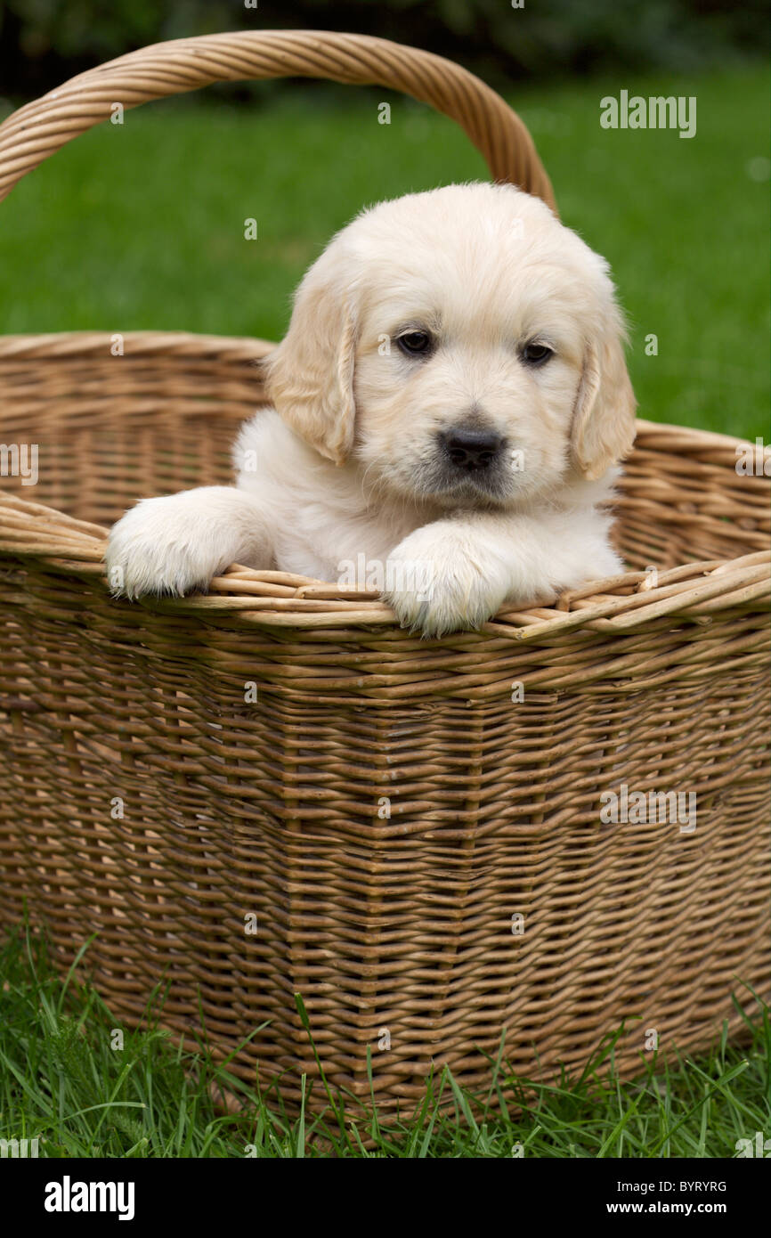 Golden Retriever Puppy In A Wicker Basket Stock Photo Alamy